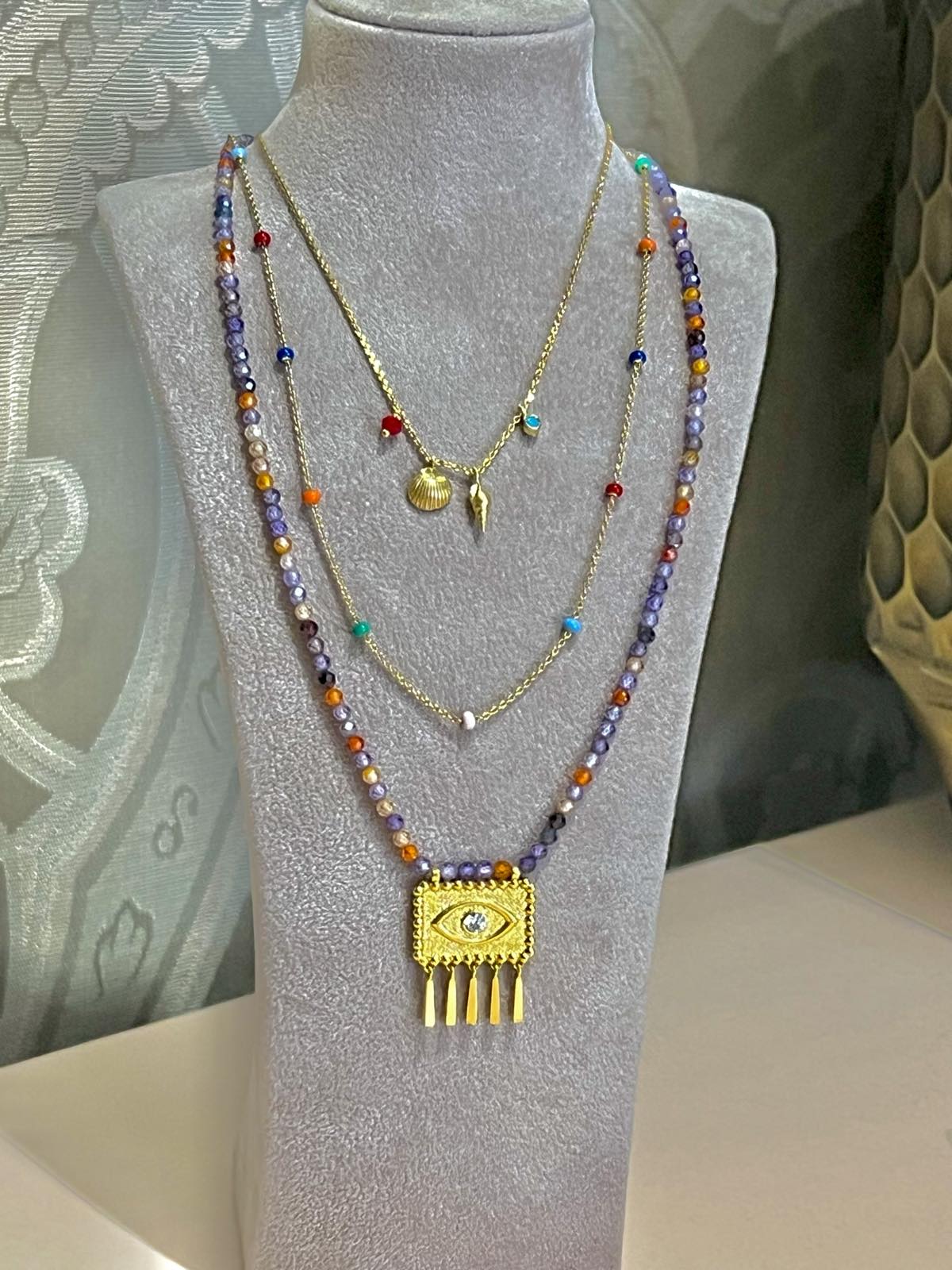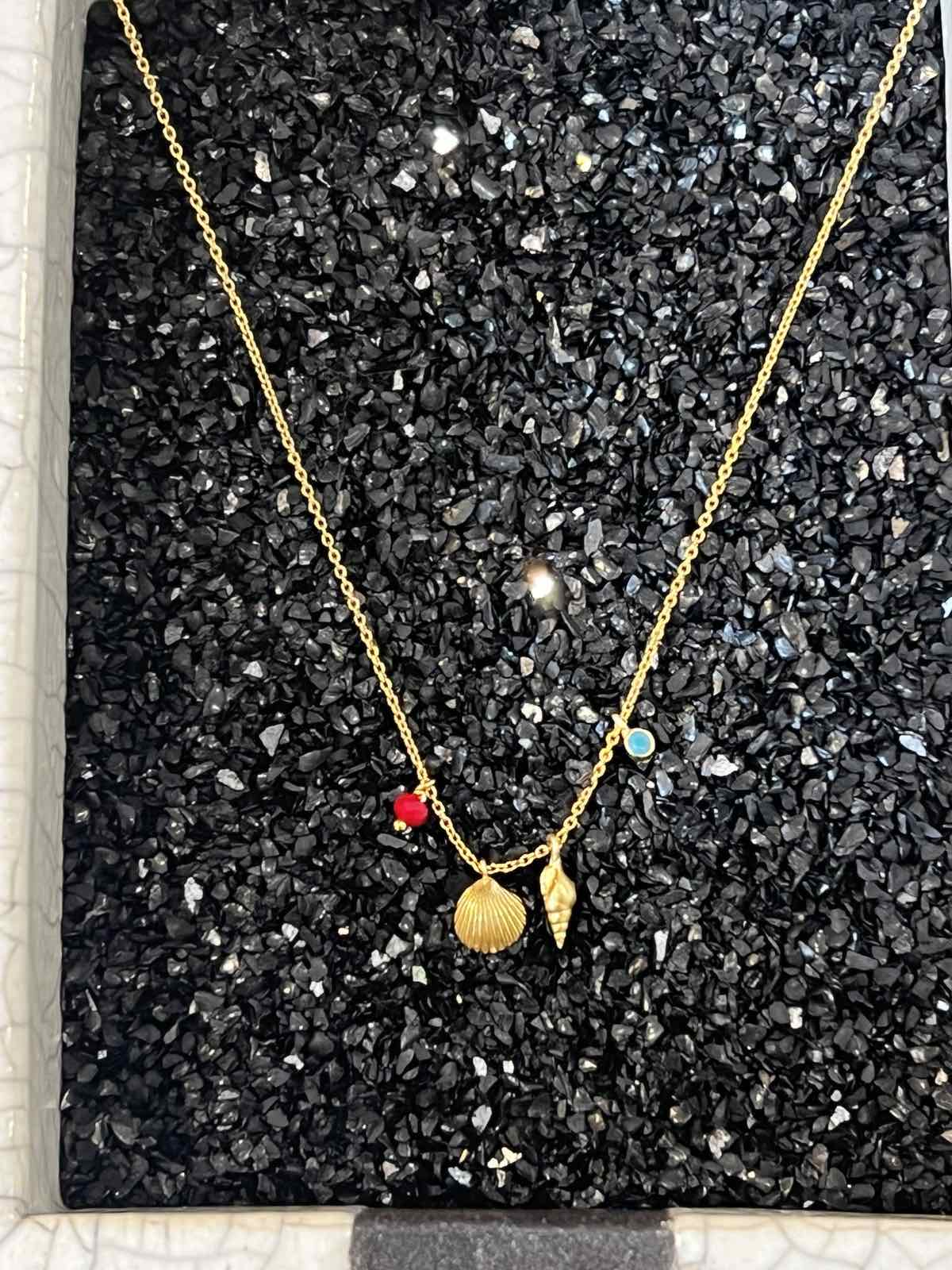Κολιέ από επιχρυσωμένο ασήμι με χρωματιστές χάντρες και κρεμαστά στοιχεία σε χρυσό
