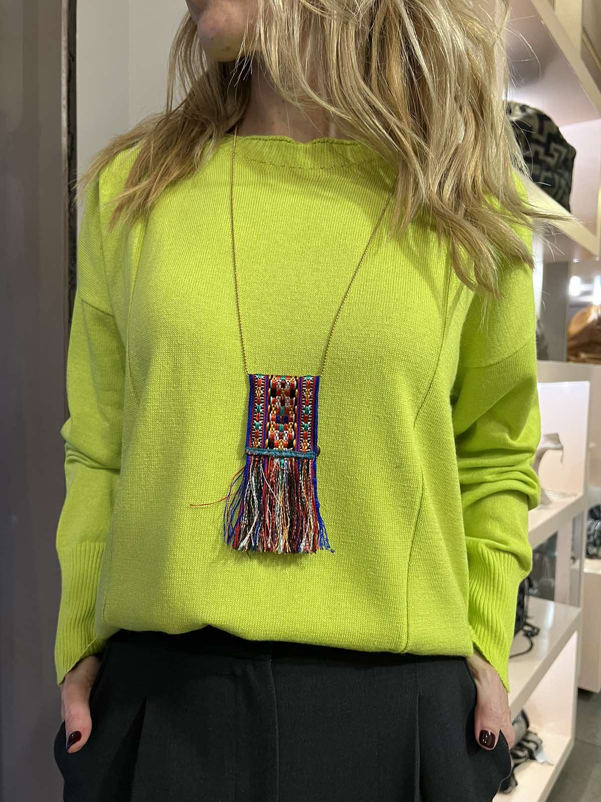 Μακρύ κολιέ με αλυσίδα και κρεμαστό στοιχείο πολύχρωμο με κέντημα , κρόσσια και χρυσές μεταλλικές λεπτομέρειες.