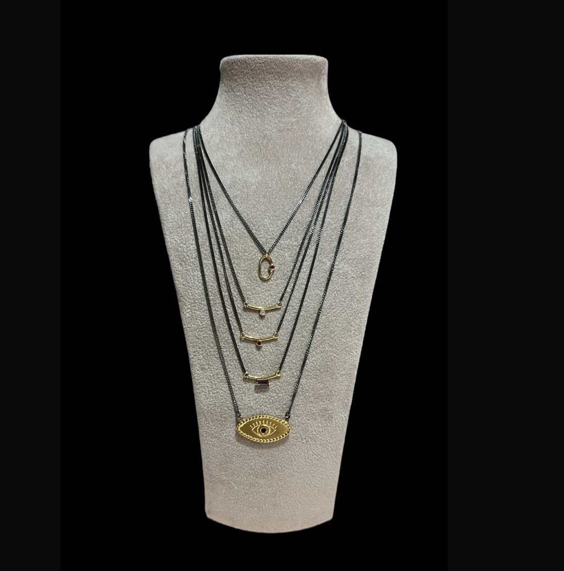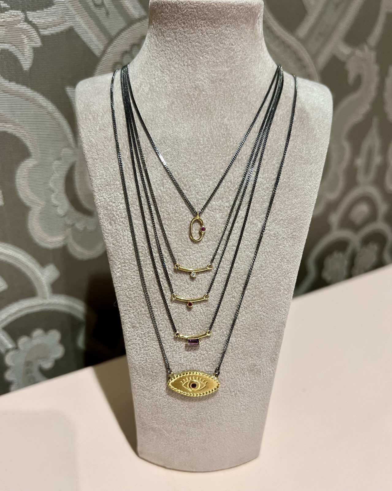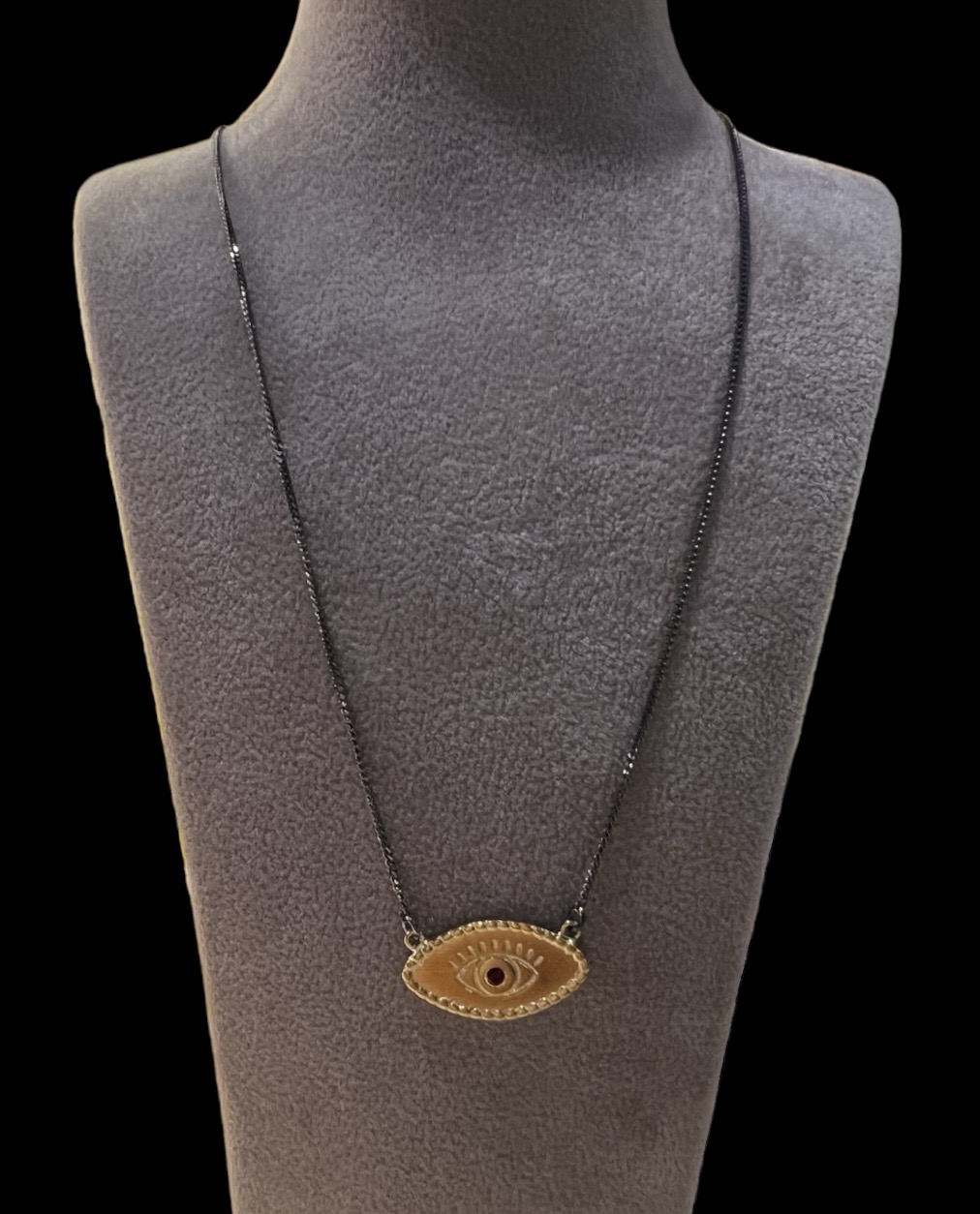 Κολιέ με αλυσίδα σε μαύρο χρώμα και κρεμαστό μάτι από επιχρυσωμένο ασήμι και ρουμπίνι.