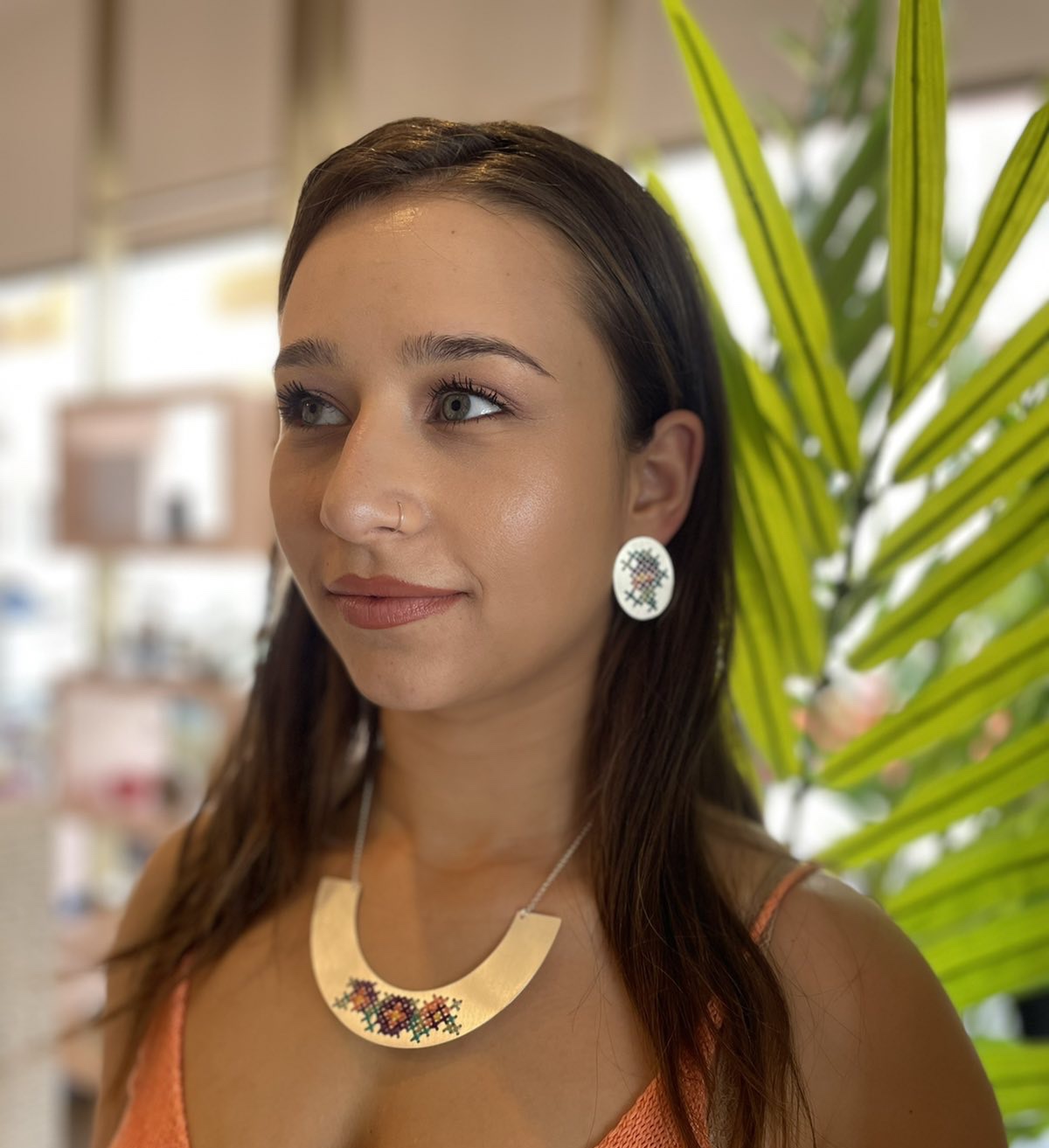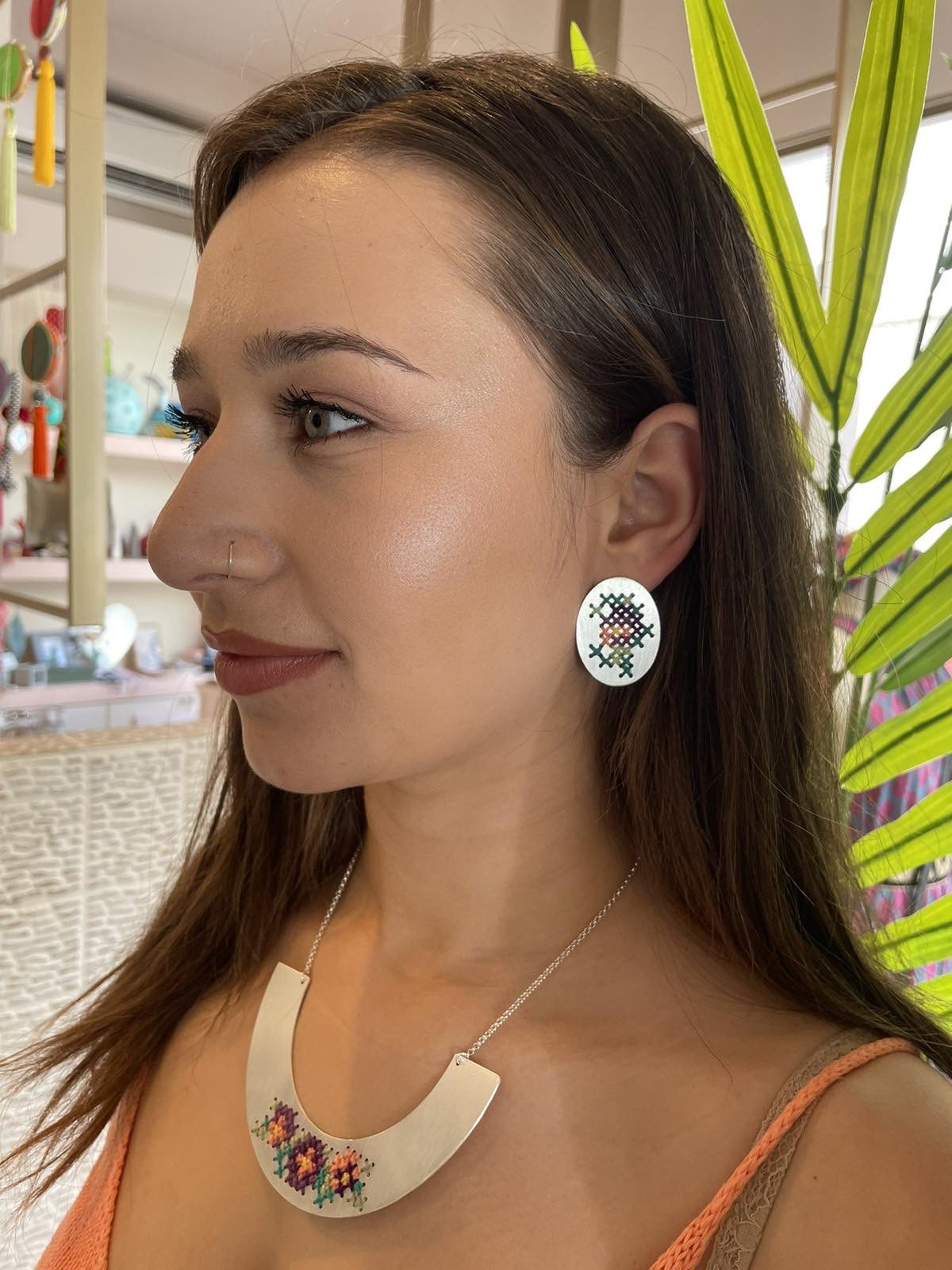 Necklace brass embroidered-steel chain